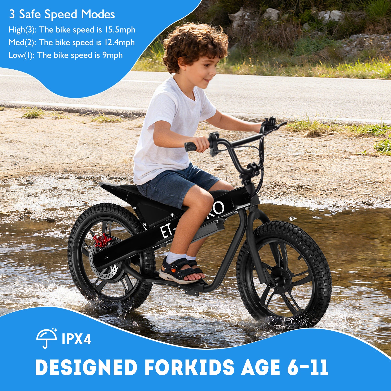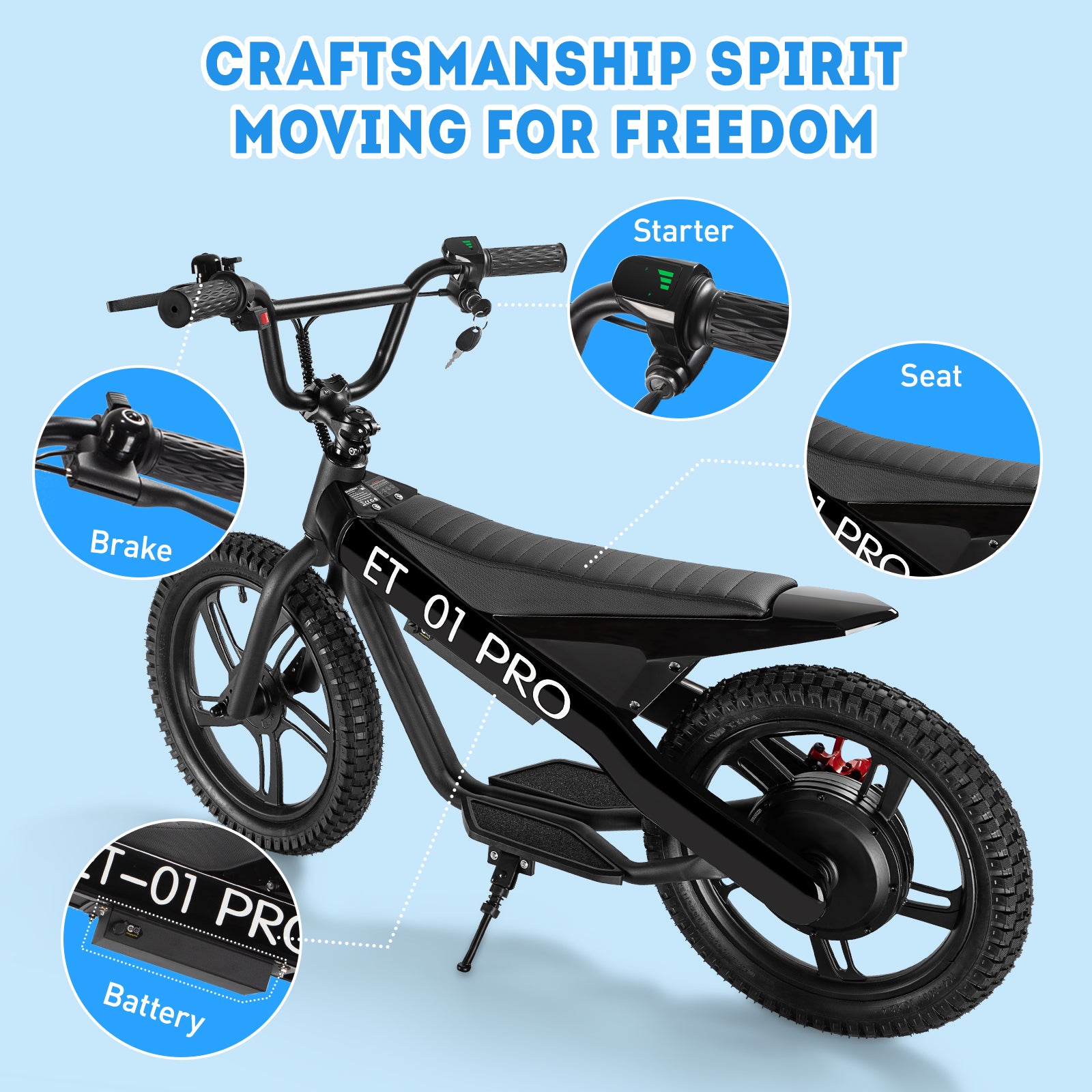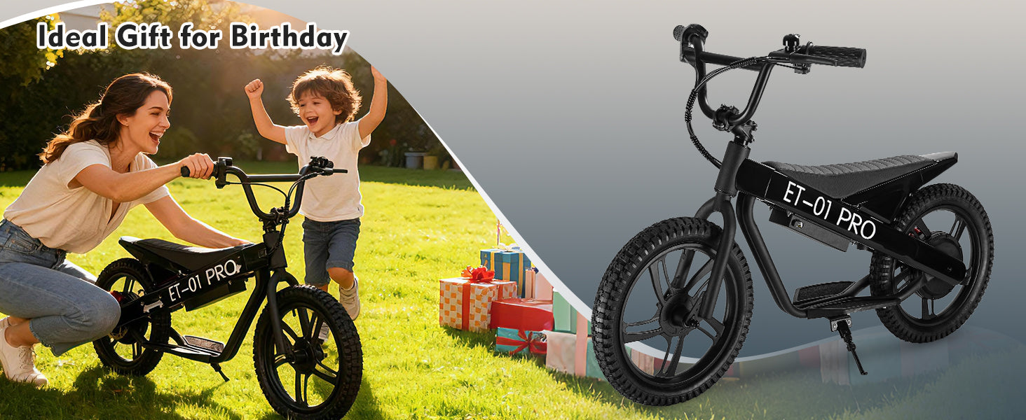 The ET-01 PRO is a 16" electric dirt bike designed for children aged 6 and above who want a real motorcycle-style experience. Featuring a powerful 350W brushless motor and a high-performance 36V 5.2Ah battery, it offers 3 speed modes to match the rider's skill level, reaching speeds up to 15.5 mph and about 10 miles of range.